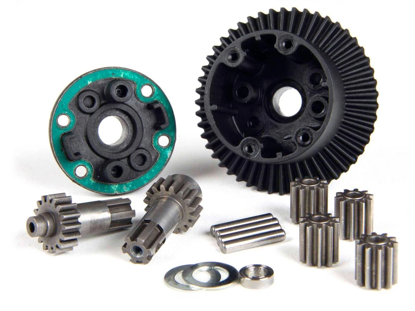 The differential module houses each assembled differential unit in an innovative yoke design. Only eight screws need to be removed to release the front and rear yokes. The power module can then be detached, allowing you to pivot the gearbox cases for access to the differentials. Each differential gear case features large pitch gears that are engineered to withstand huge torque. Internal metal gears have been chosen for reliability during extreme bashing.