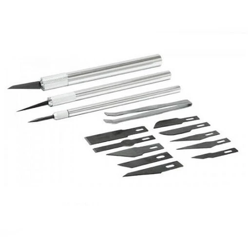 17pc Hobby Knife Set Includes 13pc hardened bladesin various shapes, pair of tweezers, and 3 aluminium handles. Suitable for cut, scratch, etch, scrape, layout and model making