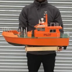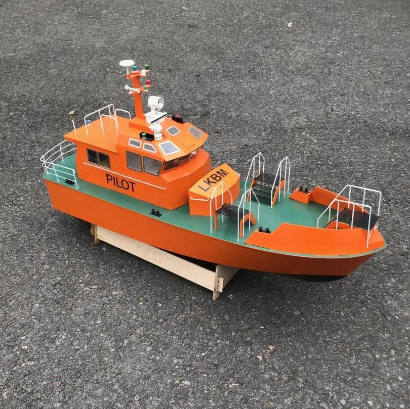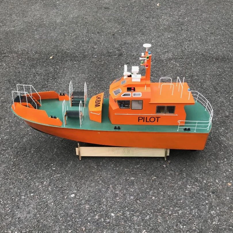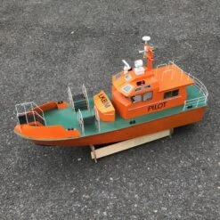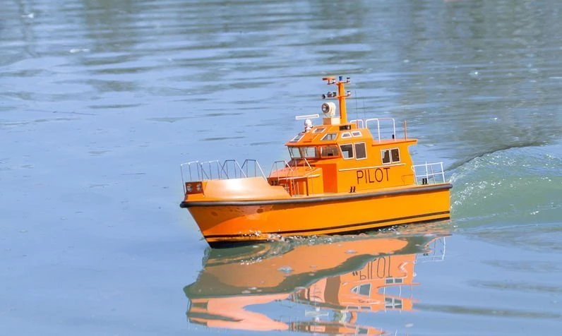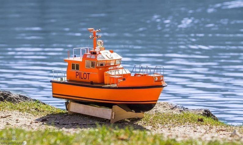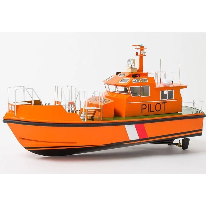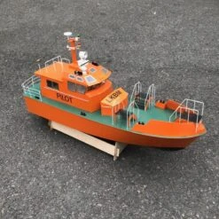 Boats of this general type are widely encountered along the Baltic and North Sea coasts. These vessels are very agile and fast, typically capable of 25 – 30 kn. Their task is to provide reliable, all-weather transport for pilots to the large ocean-going ships. The space aft of the command stand can accommodate several pilots, so that a single excursion can take all of them out to their “workplaces”. Our model very effectively incorporates the typical characteristics and handling of these boats.