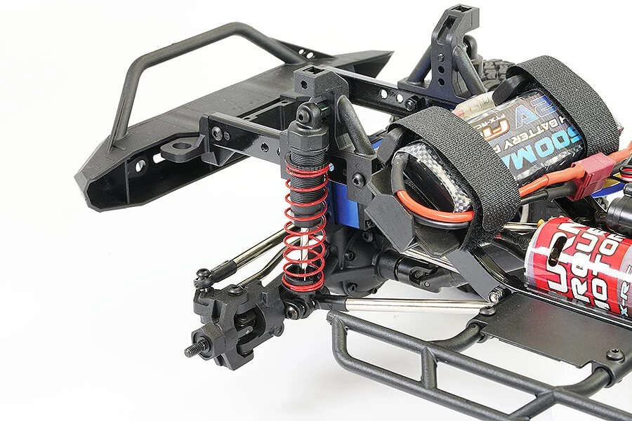A powerful Etronix 6kg steering servo, along with an improved 45° steering angle, paired with adjustable front caster angle provides exceptional maneuverability in tight spaces. The 1500mAh battery has been moved forward for improved stability, while the oill filled shock absorbers now feature threaded bodies for fine tuning adjustment.