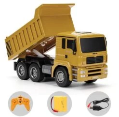 Features a 4-channel directional movement. The dumper truck features a rising and tilting rear bed where the rear section rises to drop your load at the worksite.