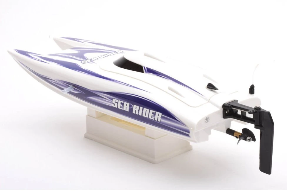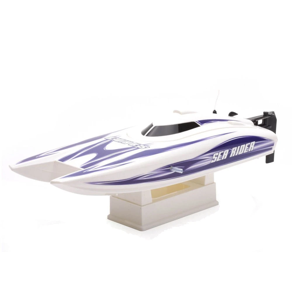 The tough moulded plastic catamaran style twin-hull design is inspired by offshore racing boats gives excellent great stability at speed. The catamaran design also helps to keep as much of the boat out of the water as possible to increase the top speed resulting in 25+ km/h top speeds!