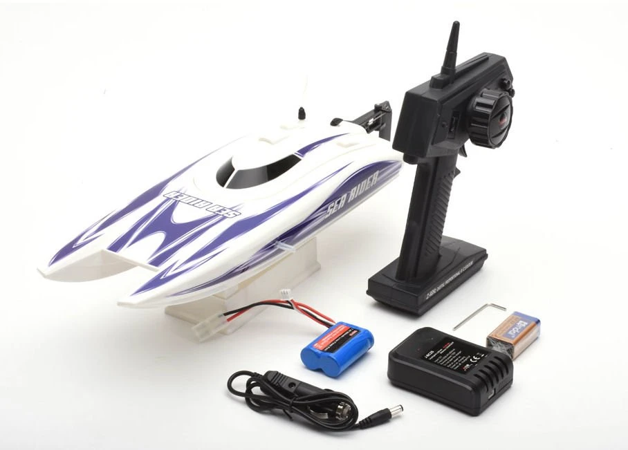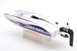 The ‘Ready to Run’ format means the Offshore Sea Rider Lite is supplied with almost everything you need in the box. This includes a high quality 2.4GHz 2 Channel pistol style transmitter, 9 gram steering servo, high capacity 7.4V lithium battery and a 12v charger perfect for plugging in your car.