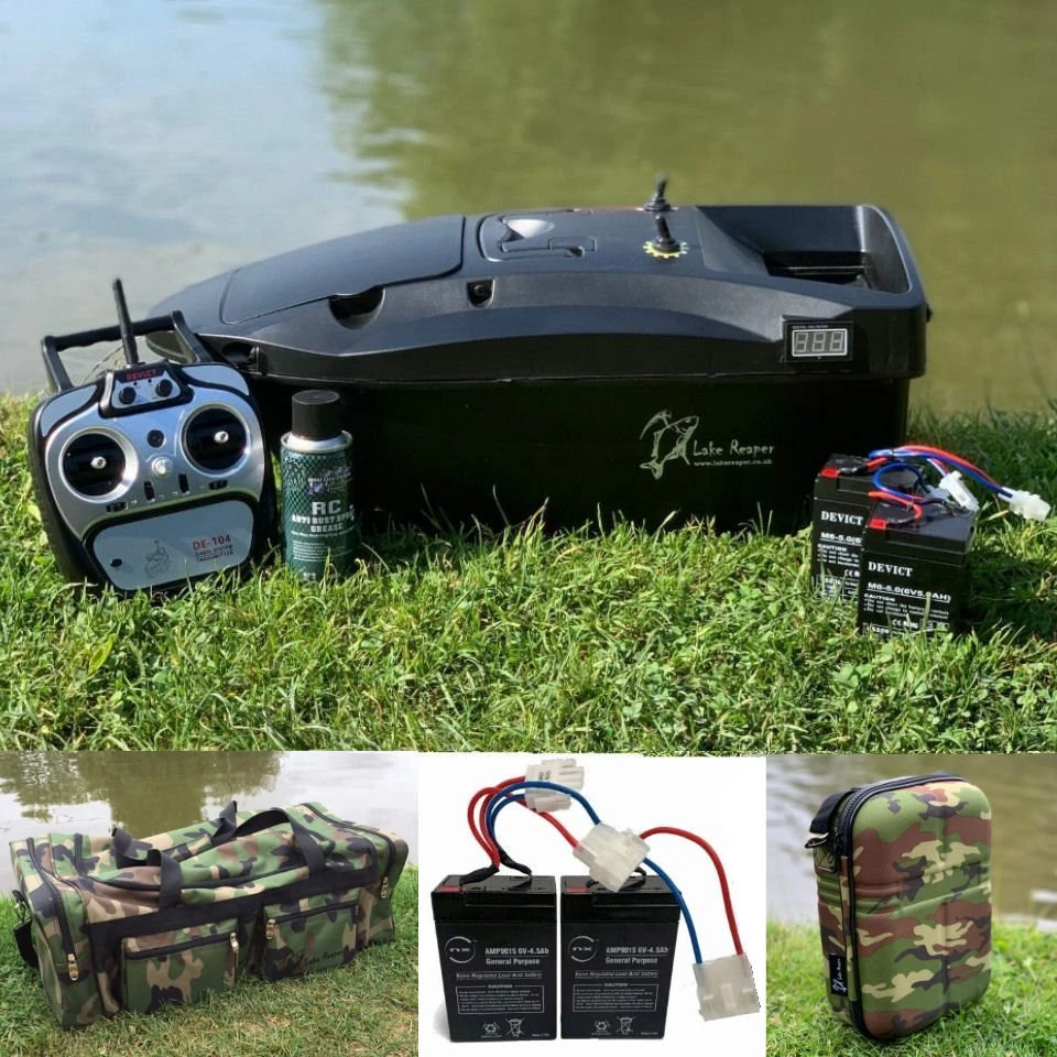 Lake Reaper Black Bait Boat Bundle with additional set of batteries, large carryall camo bag and camo transmitter case!