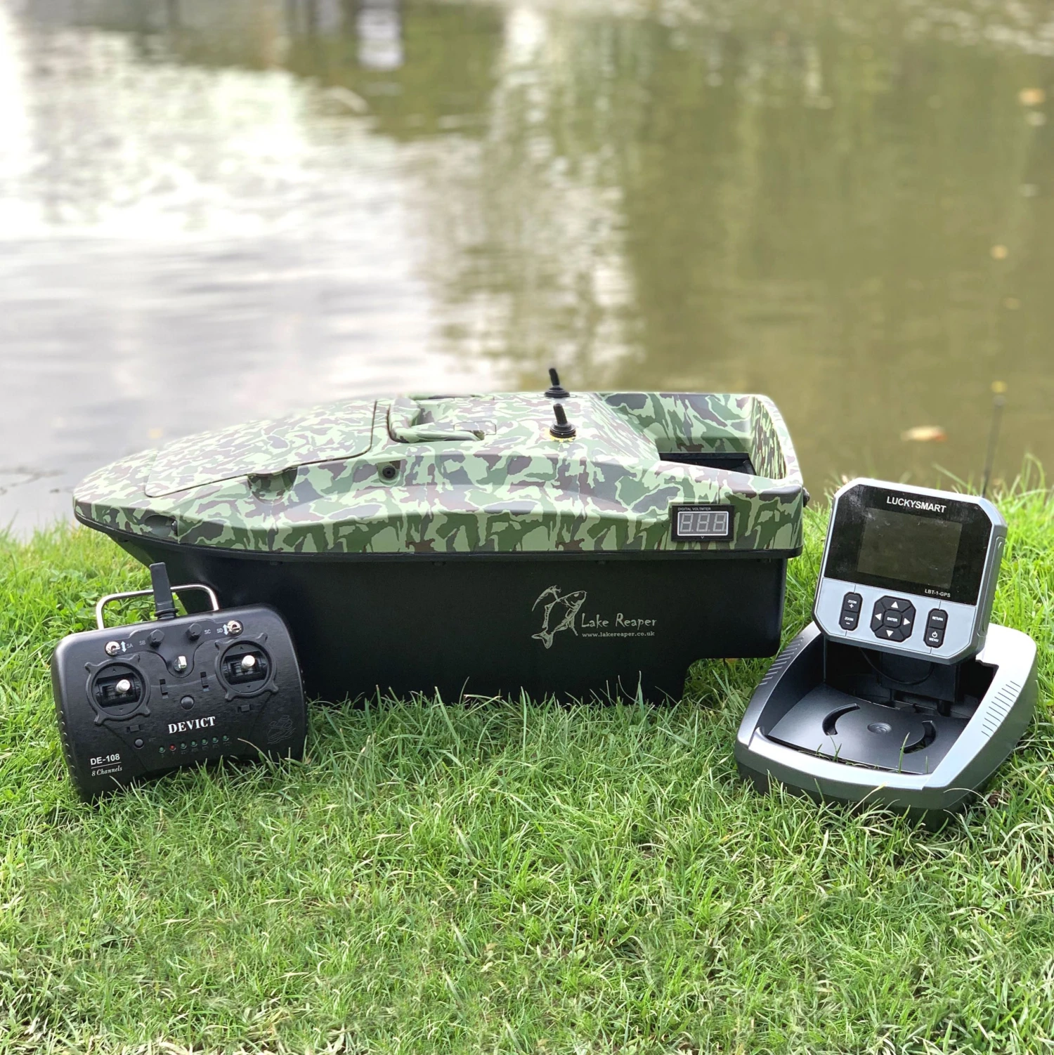 The Lucky Smart LBT-1GPS Fishfinder comes with the large base, upgraded sonar & battery box with switch. All needed to work with the lake reaper & other bait boats!