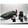 This model has a small handheld device with a rechargeable battery, upgraded sonar & receiver box + battery box with switch to power the receiver. All needed to work with the lake reaper & other bait boats!