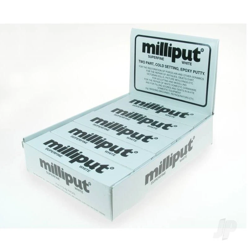 Milliput is the trade name for our epoxy putty. Milliput produce five grades: Standard Yellow/Grey, Silver Grey, Superfine White, Terracotta, and the latest addition – Milliput Black. Each grade is presented in similar packs containing 2 x 56ÌÁ7gm. sticks and the general instructions for preparation and usage are the same.The two sticks have a long shelf life but once mixed the resultant putty is at first soft and highly adhesive and then gradually hardens. Speed of hardening is dependant on temperature and at normal temperatures (20-25_C) Milliput becomes rock hard in three to four hours. By the application of heat the setting time can be reduced to a few minutes.After setting hard Milliput continues to cure and is fully cured after an elapse of time equal to the setting time at the same temperature. Once fully cured Milliput can be machined, drilled, tapped, turned, filed, sawn, sandpapered and painted. Milliput can be sandpapered and painted immediately it has set. (it is advisable to wear eye protection during this process).Milliput is an excellent adhesive and will bond any of the following to itself or to any of the others – wood, brick, cement, metals, concrete, plastics, glass etc, but note that Milliput is not intended as a thin layer adhesive and should not be used where a paste, mucilage or thin glue is indicated. Milliput will set under water and is heat resistant up to 130°C.Shelf Life:We recommend Milliput is stored in cool, dry conditions. Please reseal bags after use. Stored correctly this product should remain workable for about 2 years.