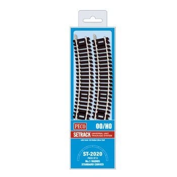 Peco ST-2020 is a Multipack x 8 of the Peco ST-2020 00/H0 No 1 Radius Standard Curve which has a 22 Β½ΒΊ angle, 16 per circle.371mm (14 5/8in) radius.