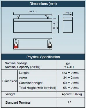 6 Volt 3.4 Amp.Hr. Sealed Rechargeable batter